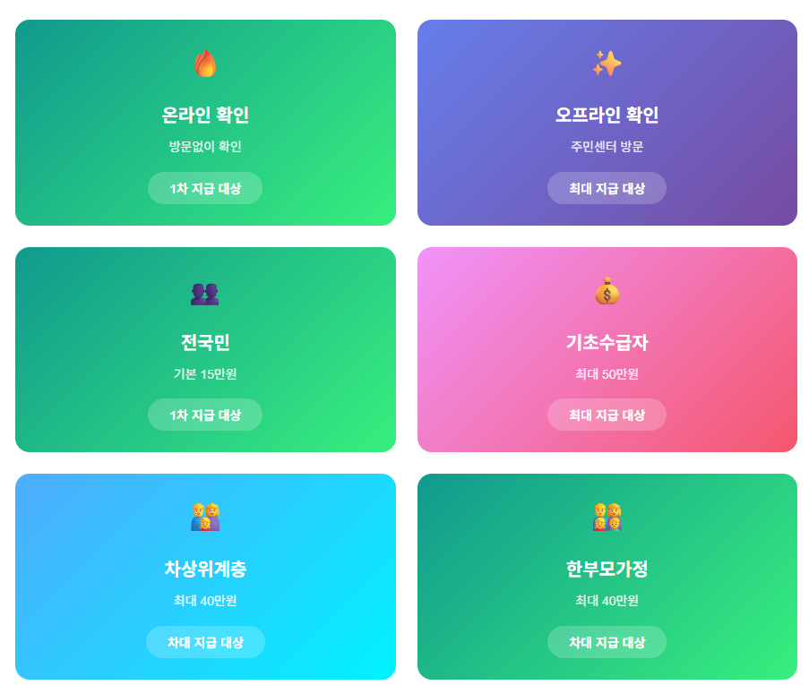- 지급 금액: 소득 하위 90%는 25만 원, 차상위계층은 40만 원, 기초생활수급자는 50만 원까지 지급