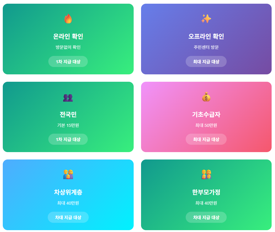 기본 15만 원(1차)부터 최대 50~55만 원(1·2차 합계 + 지역 추가분)까지, 수급자별로 달라지니 아래 표를 확인해 보세요.