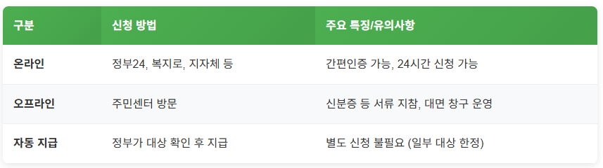 신분증 유효기간, 통장 사본 준비, 자격 증빙서류(기초생활수급자 증명서 등) 등을 미리 준비해두면 신청 과정이 훨씬 빨라집니다.